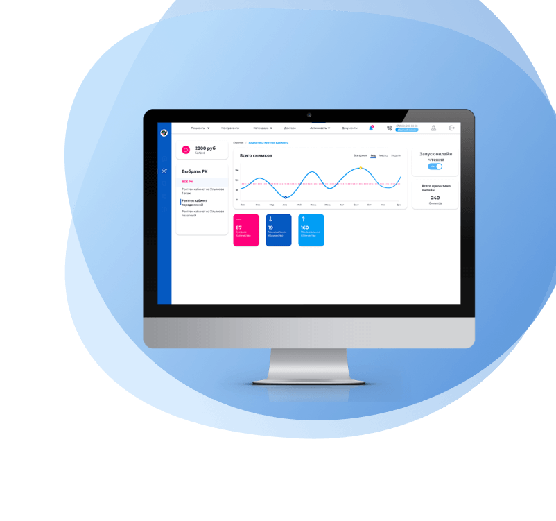 CRM система помогает держать все под контролем. В пару кликов получить статистику по обследованиям и аналитику нагрузки рентгеновского кабинета.